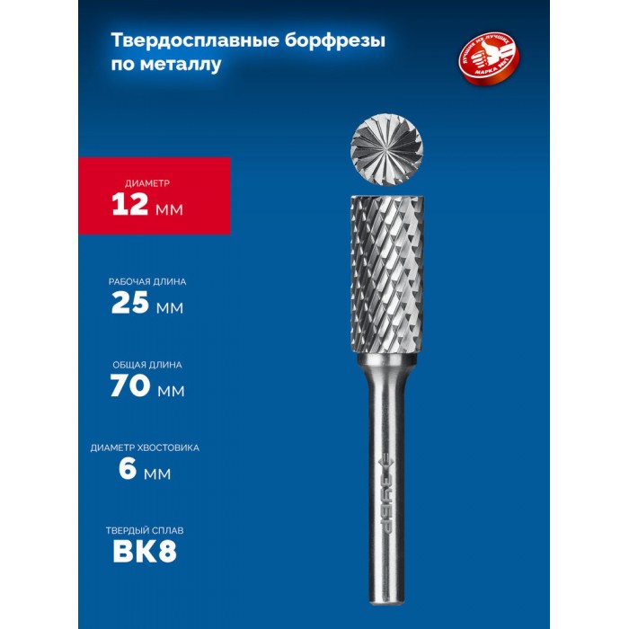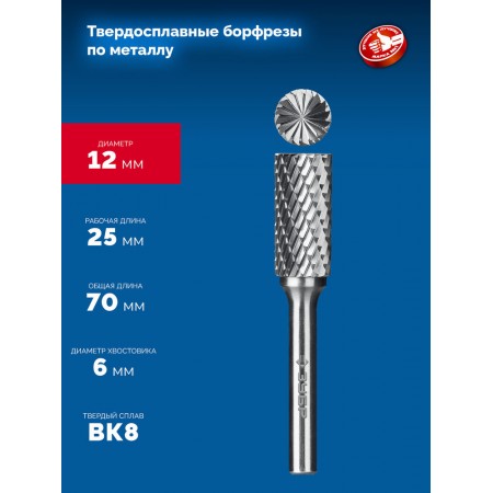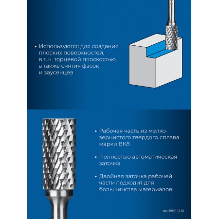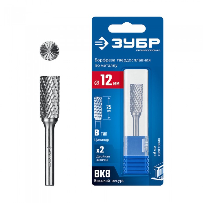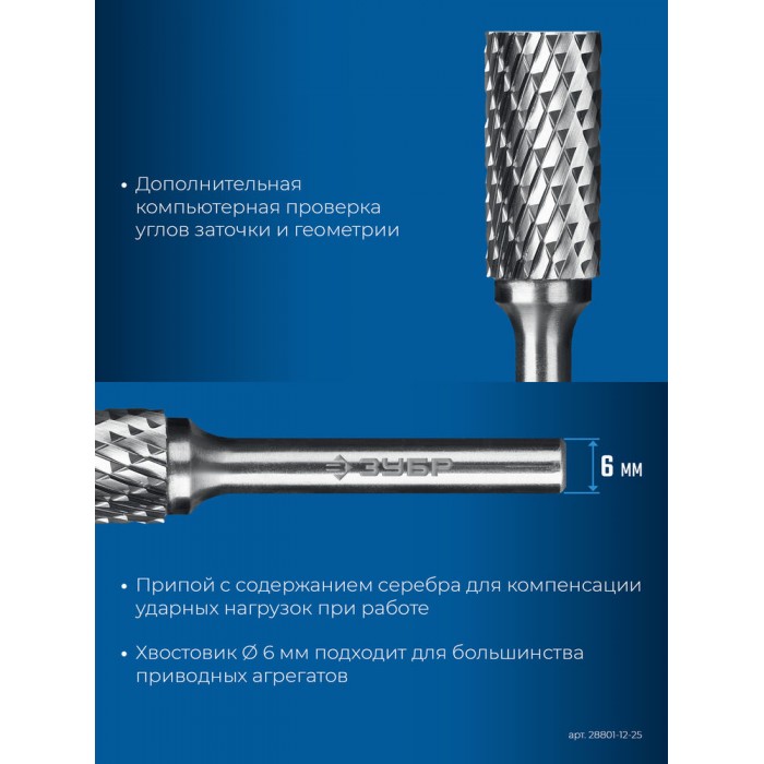 Борфреза твердосплавная 12?25 мм, тип B (цилиндр с торцевыми зубьями), хв-к 6 мм ЗУБР ПРОФЕССИОНАЛ 28801-12-25