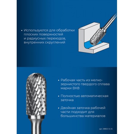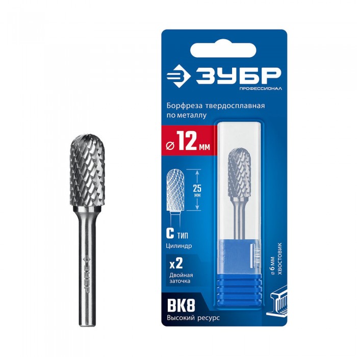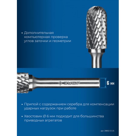 Борфреза твердосплавная 12?25 мм, тип C (цилиндр со сферическим концом), хв-к 6 мм ЗУБР ПРОФЕССИОНАЛ 28802-12-25