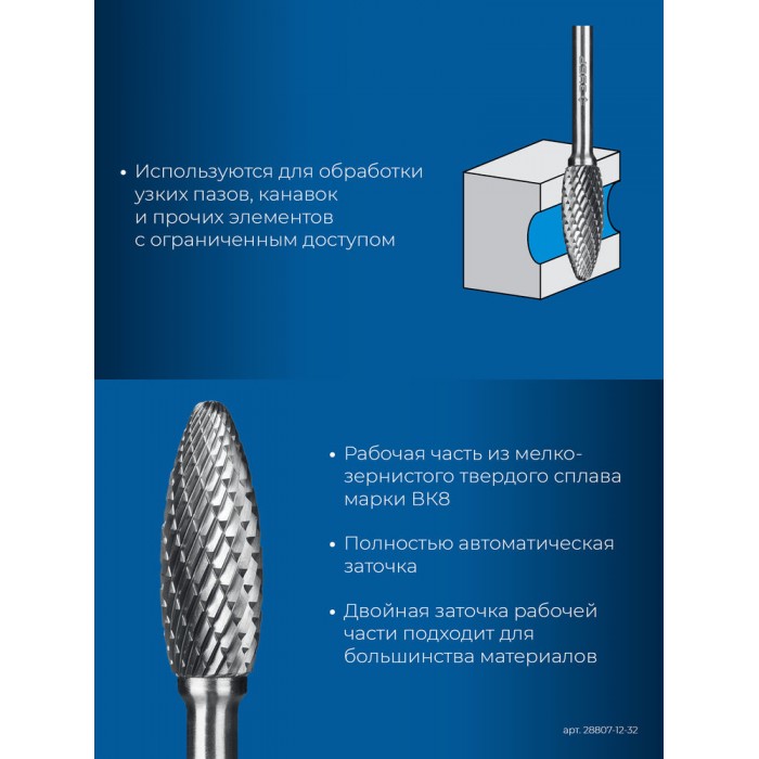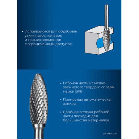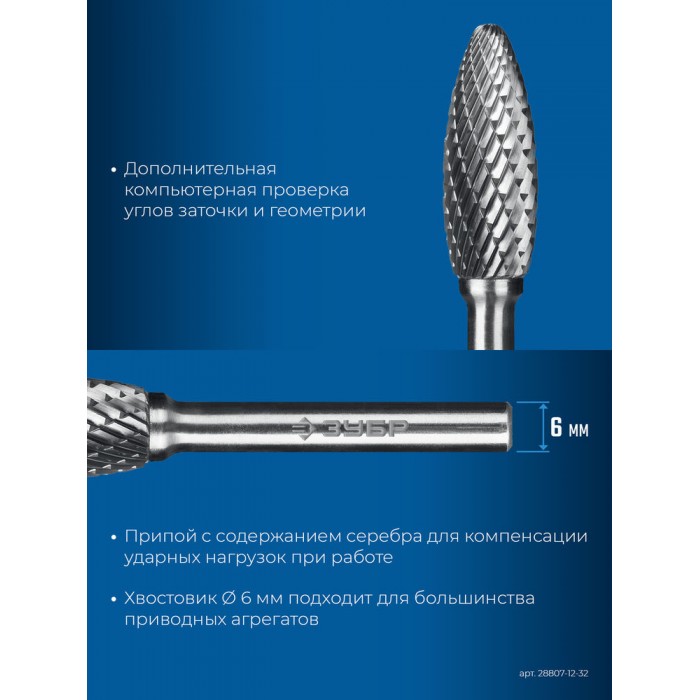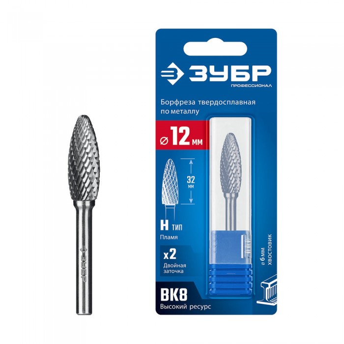 Борфреза твердосплавная 12?32 мм тип H пламя радиус 2.5 мм хв-к 6 мм Профессионал ЗУБР 28807-12-32