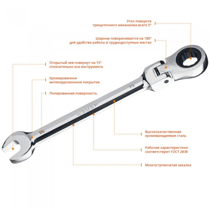 Ключ гаечный шарнирный трещоточный 13 мм Профессионал ЗУБР 27101-13