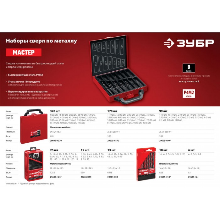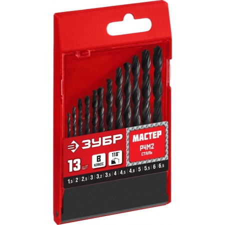 Набор сверл по металлу 13 шт, 1.5–6.5 мм, сталь Р4М2, класс В ЗУБР 29605-H13