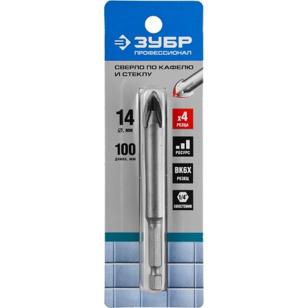 Сверло по стеклу и кафелю 14 мм, 4-х кромка, HEX 1/4 ЗУБР Профессионал 29845-14_z01