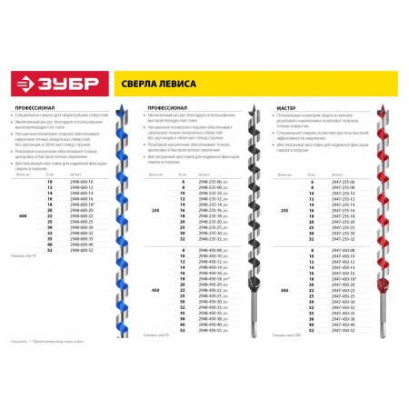 Сверло левиса по дереву 14?450/360 мм шестигранный хвостовик ЗУБР 2947-450-14