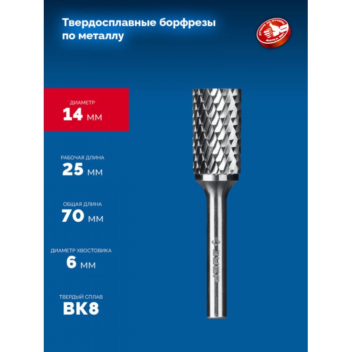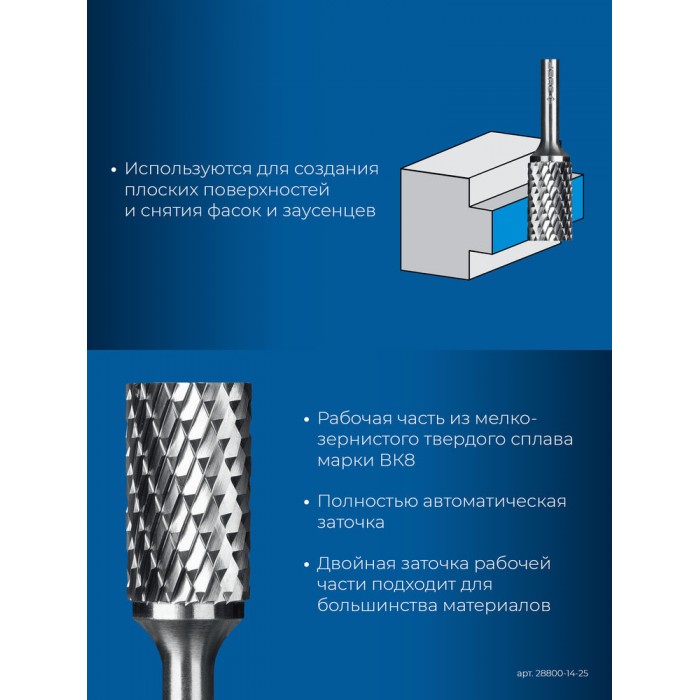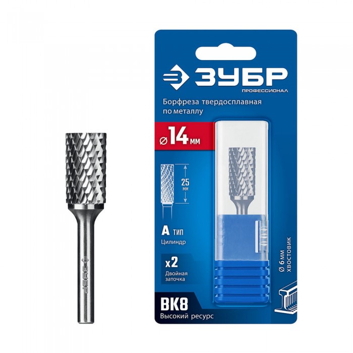 Борфреза твердосплавная 14?25 мм тип А цилиндр с гладким торцом хв-к 6 мм Профессионал ЗУБР 28800-14-25