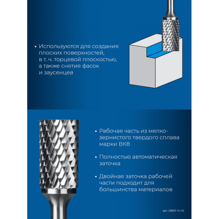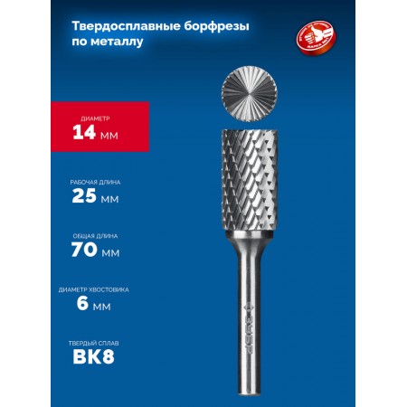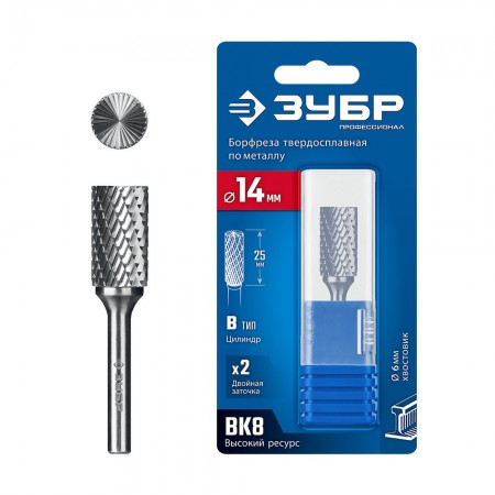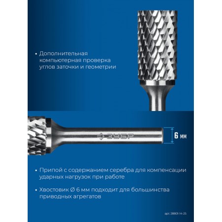 Борфреза твердосплавная 14?25 мм, тип B (цилиндр с торцевыми зубьями), хв-к 6 мм ЗУБР ПРОФЕССИОНАЛ 28801-14-25