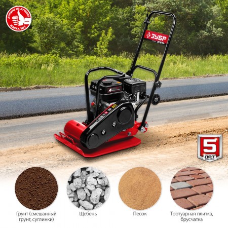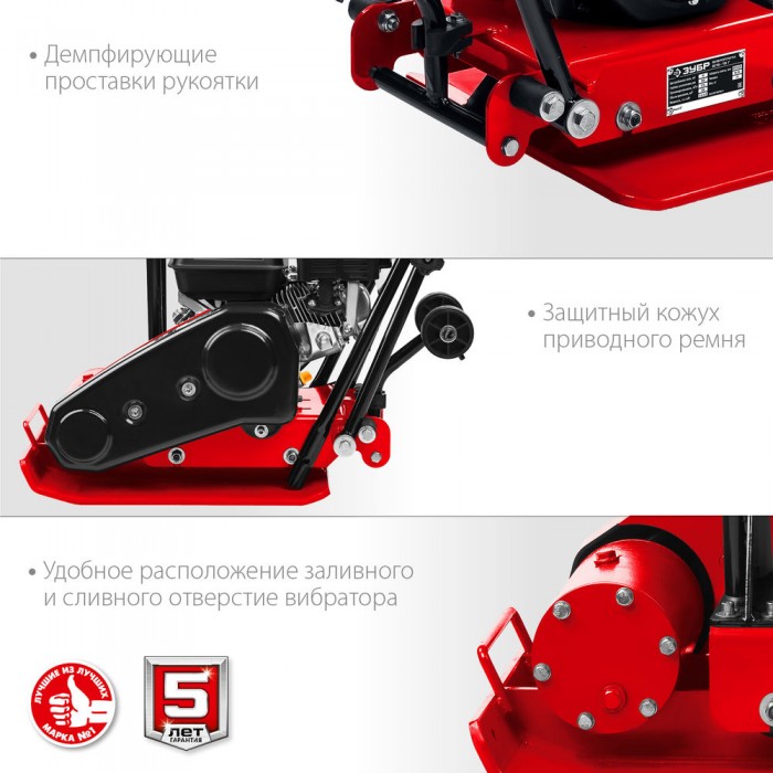 Виброплита предназначена для уплотнения бетонных, асфальтовых и сыпучих материалов, а также для формирования уплотненных поверхностей. Компактная конструкция позволяет осуществлять уплотнение смешанного грунта в самых узких местах, даже в очень узких траншеях. Направляющая рукоятка с виброзащитой позволяет увеличить количество часов непрерывной работы и снизить усталость для оператора. Четырехтактный двигатель ″ЗУБР″ обеспечит беспроблемную эксплуатацию при минимальном сервисном обслуживании на весь срок использования.