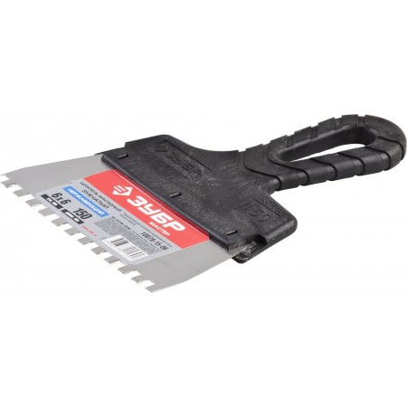 Благодаря зубчатой кромке шпатель идеально подходит для работы со строительными и клеевыми смесями, полотно из нержавеющей стали обеспечивает надежность и долгий срок службы инструмента, а удобная пластмассовая рукоятка создает условия для комфортной работы