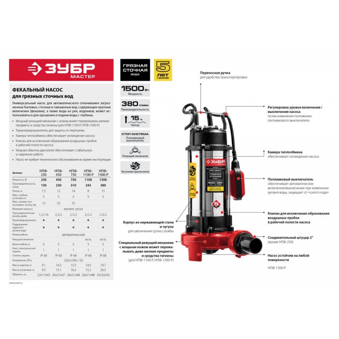 Насос фекальный с режущим механизмом 1500 Вт ЗУБР НПФ-1500-Р