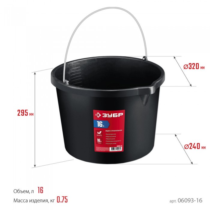 Ведро строительное 16 л, ударопрочный пластик, с носиком ЗУБР 06093-16
