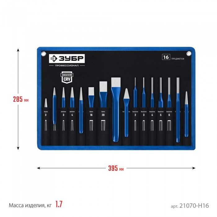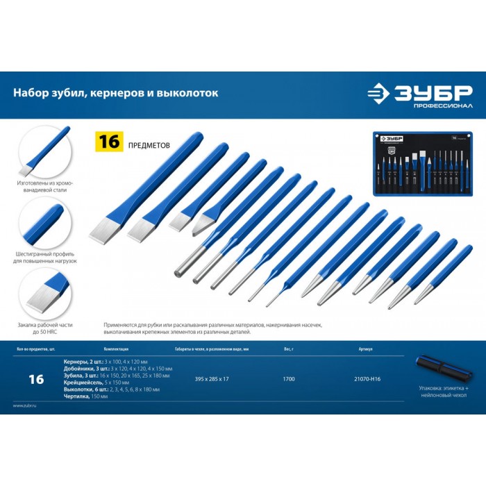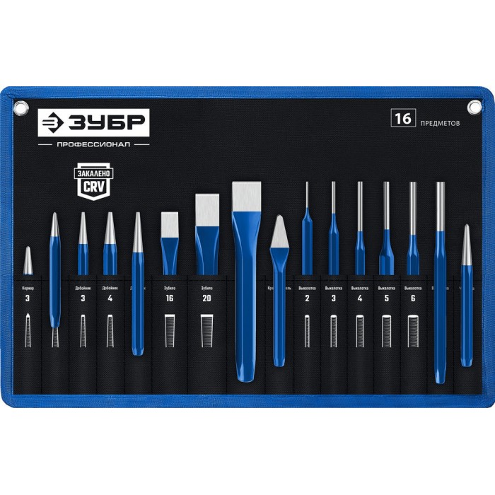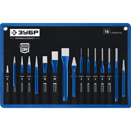 Набор шестигранных зубил и кернеров 16 предметов, в чехле ЗУБР Профессионал 21070-H16