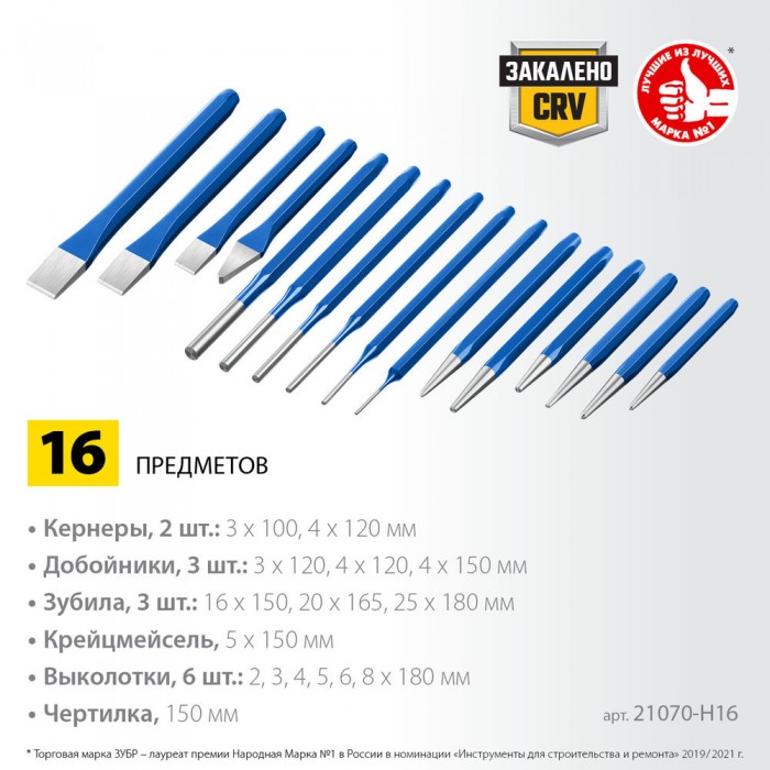Набор высококачественных зубил и кернеров. Произведены из хромованадиевой стали. Шестигранный профиль для повышенных нагрузков. Закалены