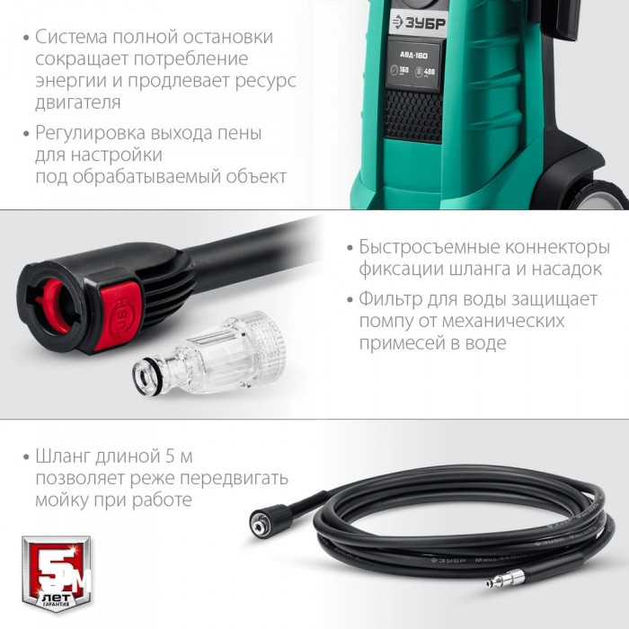 Мощное изделие для удаления любых загрязнений при помощи струи воды высокого давления. Благодаря системе полной остановки, помпа не работает при ненажатом пистолете – это экономит воду и ресурс изделия при неизбежных паузах в работе. Элегантный дизайн и удобная конструкция с держателями для аксессуаров делают работу с изделием комфортной. Регулировка выходной струи позволяет обрабатывать различные поверхности - автомобили, стены, велосипеды, напольные покрытия и т.п.