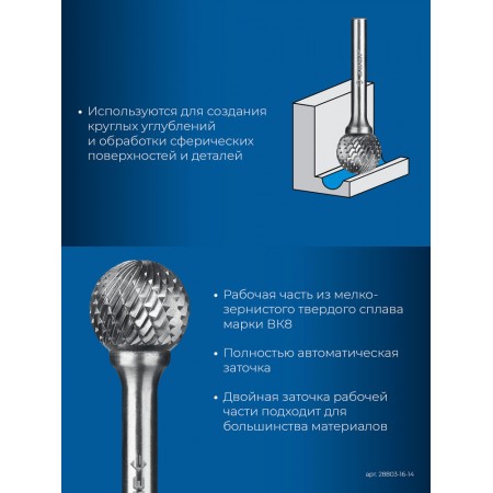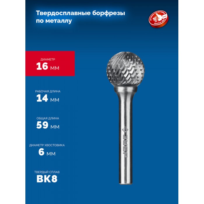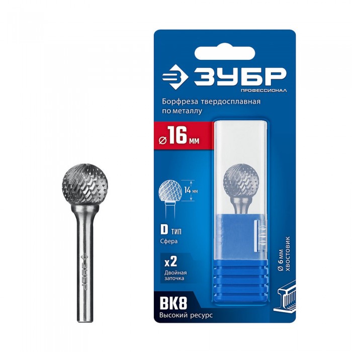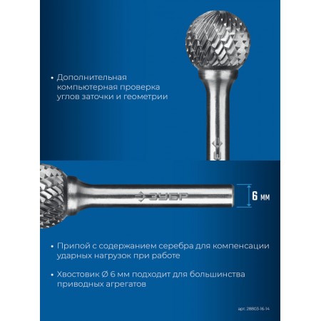 Борфреза твердосплавная 16?14 мм, тип D (сфера), хв-к 6 мм ЗУБР ПРОФЕССИОНАЛ 28803-16-14