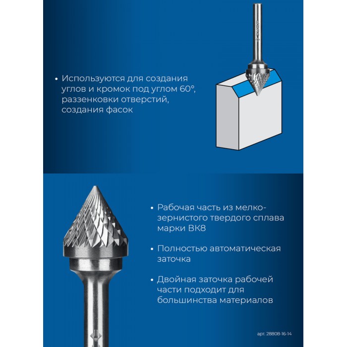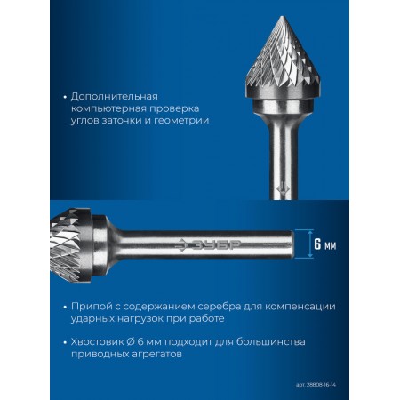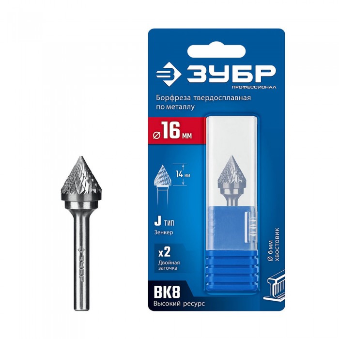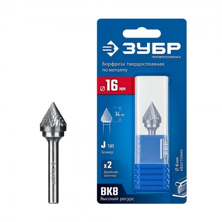 Борфреза твердосплавная 16?14 мм, тип J (зенкер с вершиной 60°), хв-к 6 мм ЗУБР ПРОФЕССИОНАЛ 28808-16-14