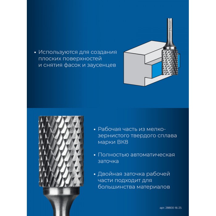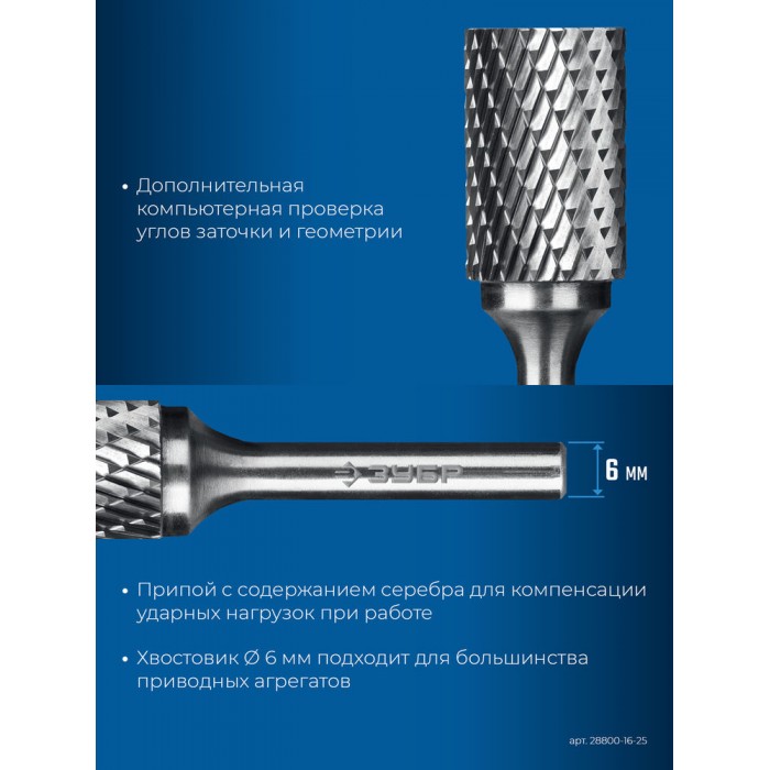 Борфреза твердосплавная 16?25 мм тип А цилиндр с гладким торцом хв-к 6 мм Профессионал ЗУБР 28800-16-25