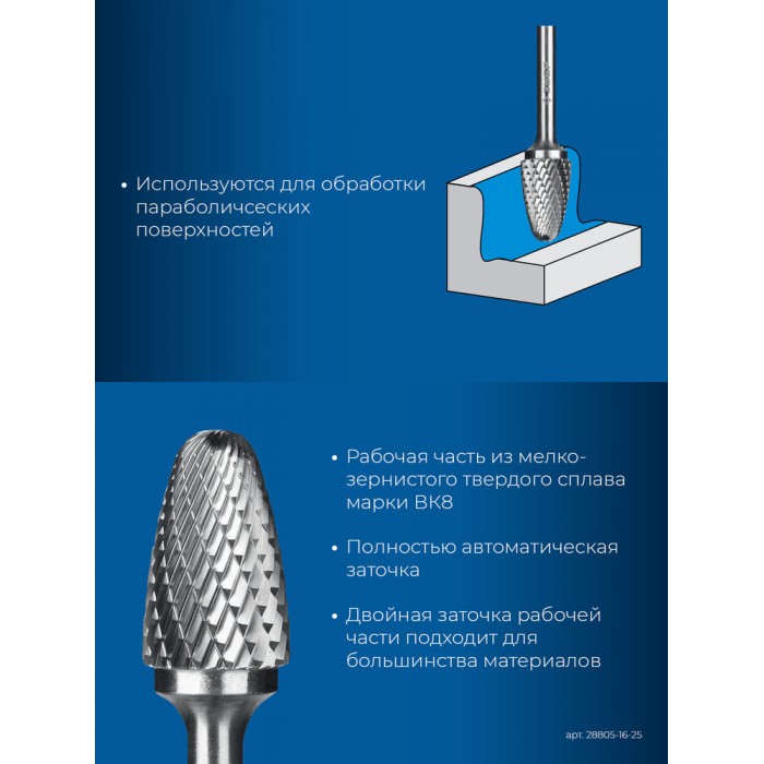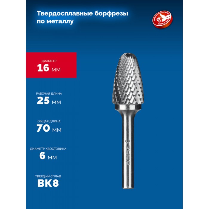Борфреза твердосплавная 16?25 мм тип F парабола с закругленным углом радиус 4.0 мм хв-к 6 мм Профессионал ЗУБР 28805-16-25