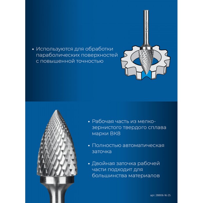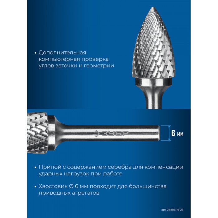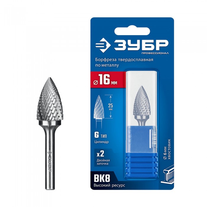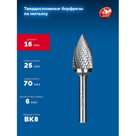 Борфреза твердосплавная 16?25 мм тип G парабола с острым углом хв-к 6 мм Профессионал ЗУБР 28806-16-25