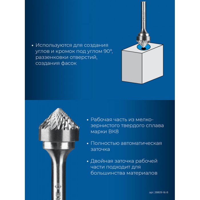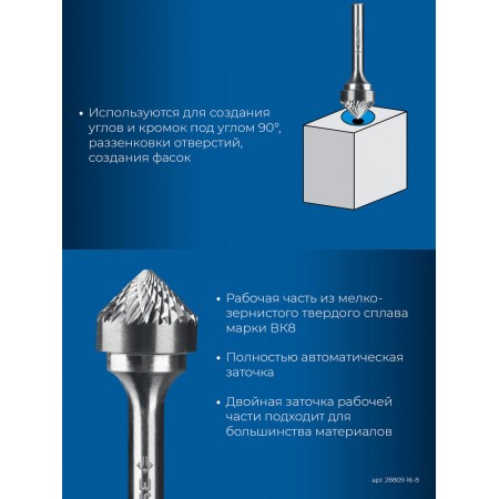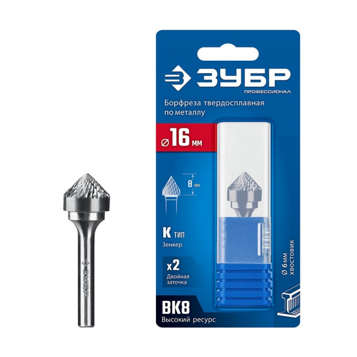 Борфреза твердосплавная 16?8 мм тип K зенкер с вершиной 90° хв-к 6 мм Профессионал ЗУБР 28809-16-8
