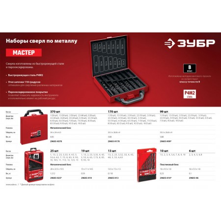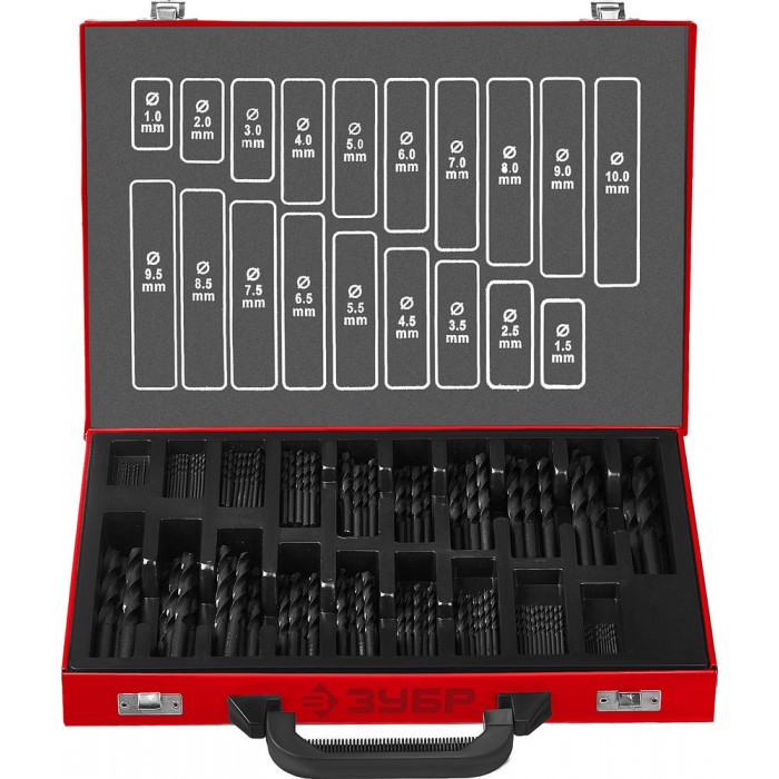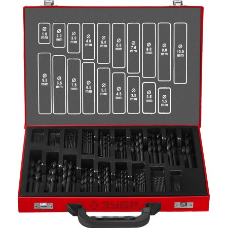 Набор сверл по металлу 170 шт, 1–10 мм, сталь Р4М2, класс В, металлический бокс ЗУБР 29605-H170