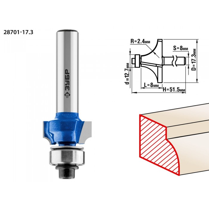 Фреза кромочная калевочная №1 17.3?8 мм радиус 2.4 мм ЗУБР Профессионал 28701-17.3