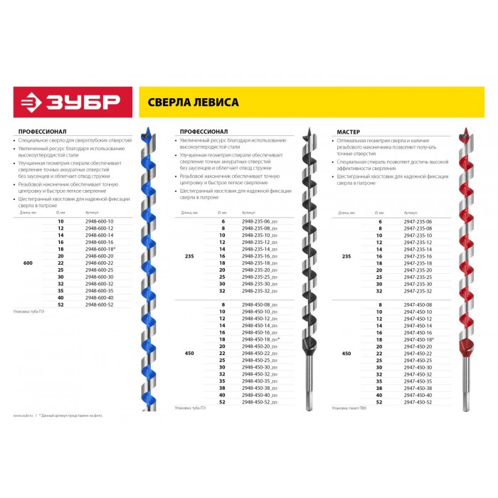 ЗУБР 18 x 600/400 мм, шестигранный хвостовик, cверло левиса по дереву (2948-600-18)