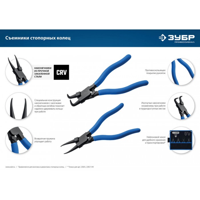 Профессиональные съемники стопорных колец изготовлены из кованой хромованадиевой стали со специальным покрытием, защищающим от коррозии
