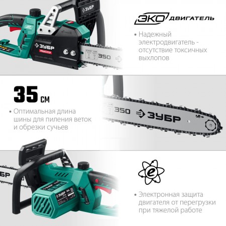 - Шина длиной 350 мм позволяет распиливать заготовки большого диаметра