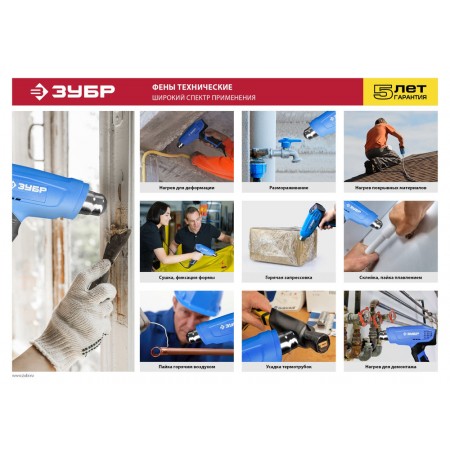 Для генерации горячего воздуха. Используется: при сушке и/или снятии лакокрасочных покрытий, сушки клеевых соединений и/или клейки путем нагрева, сушки штукатурки, шпатлевки, изделий из гипса и аналогичных материалов, монтажа окантовок, трубок и проч. методом горячей усадки, посадки с нагревом, горячей деформации, размораживания труб, разъема резьбовых соединений, сушки влаги, пайки, лужения, дезинфекции и т. д.
