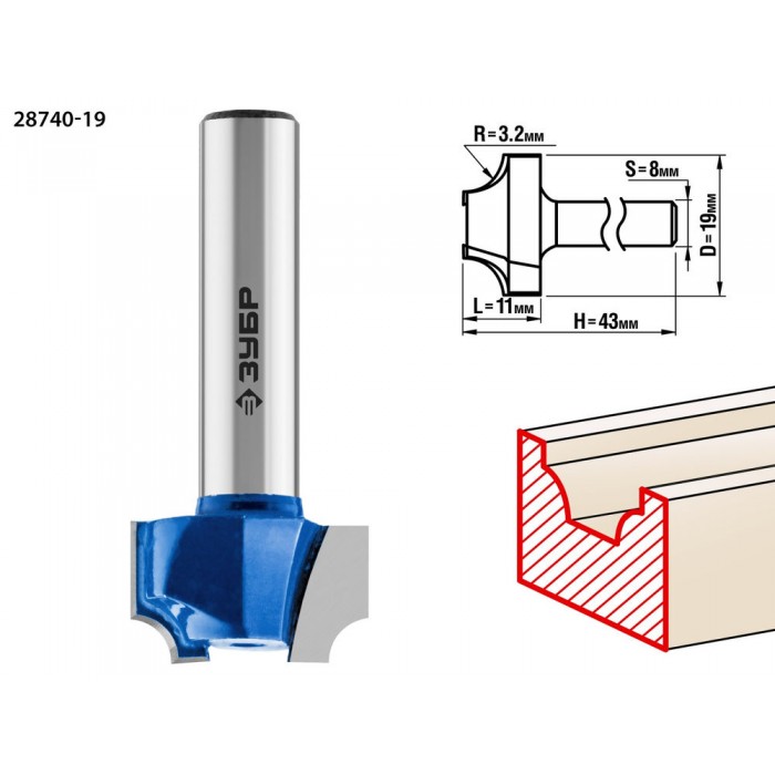 Фреза пазовая фасонная №1 19?11 мм радиус 3.2 мм ЗУБР Профессионал 28740-19