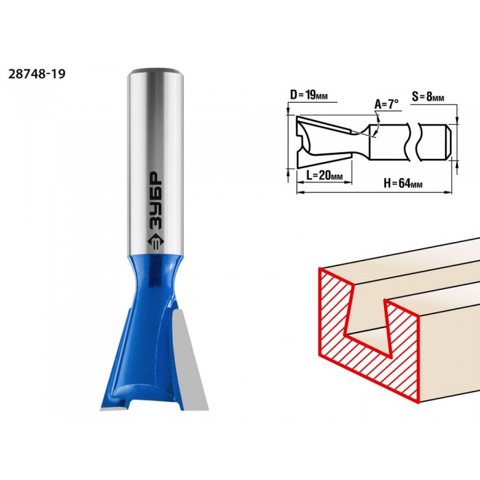 Фреза пазовая фасонная Ласточкин Хвост 19?20 мм угол 7° ЗУБР Профессионал 28748-19