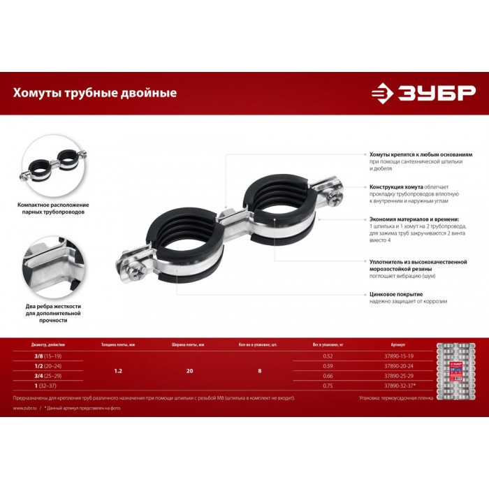 Стальные трубные хомуты выдерживают большие нагрузки и надежно фиксируют трубы различного назначения на любых основаниях. Труба прочно зажимается внутри хомута метрическими винтами. Двойной хомут позволяет компактно проложить парные трубопроводы и сэкономить на материалах и времени монтажа. Уплотнитель из высококачественной резины обеспечивает идеальную шумоизоляцию.