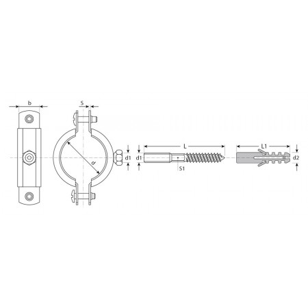 - Комплектность набора позволяет крепить хомут как с помощью гайки, так и с использованием шпильки и дюбеля
