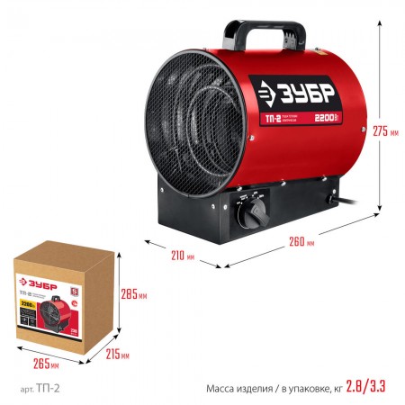 Компактный и легкий обогреватель в круглом корпусе для квартиры, загородного дома, мастерских гаражей и т.д. Большая площадь ТЭНов и эффективный обдув способствуют более быстрому нагреву помещения. Конструктивные меры безопасности (дополнительный защитный кожух, термопредохранитель, заземление корпуса) защищают Вас и изделие при нештатных ситуациях. Сделано в России ЗУБР - тепло и уют Вашего дома