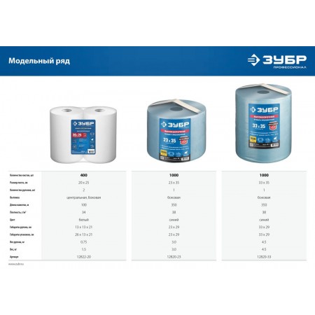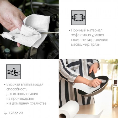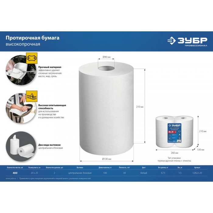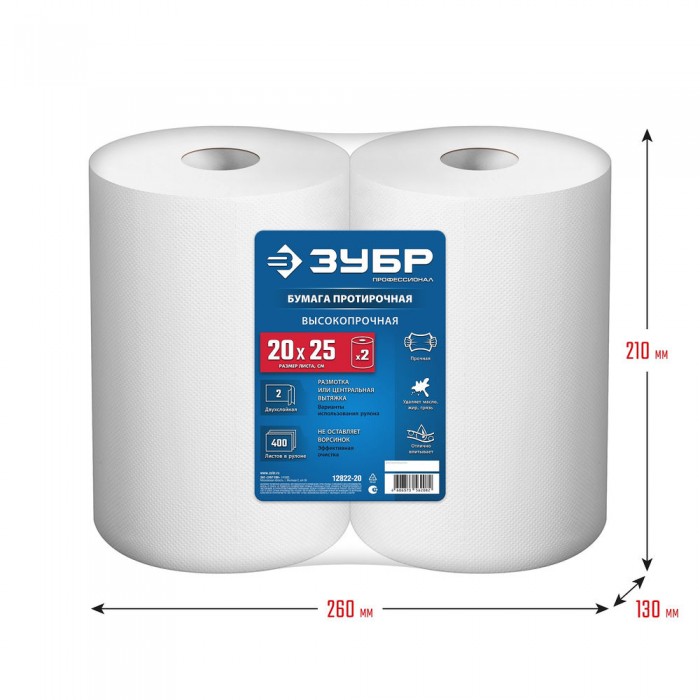 Бумага протирочная 20?25 см, 2-х слойная, в рулоне, 400 листов, 2 рулона ЗУБР Профессионал 12822-20