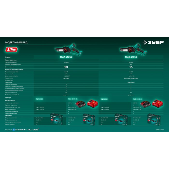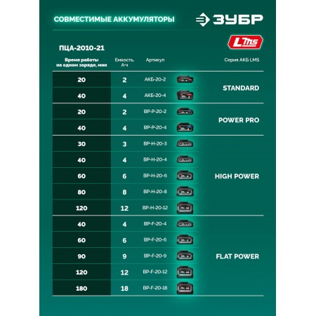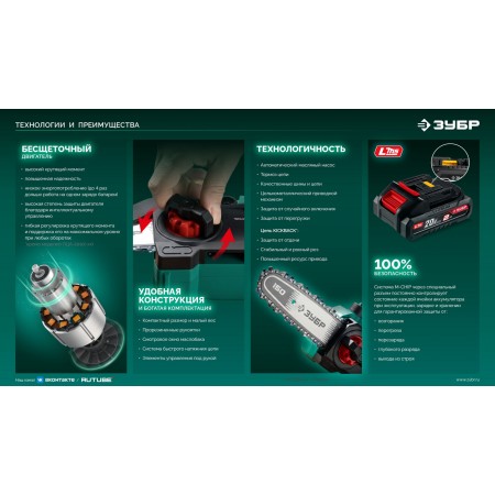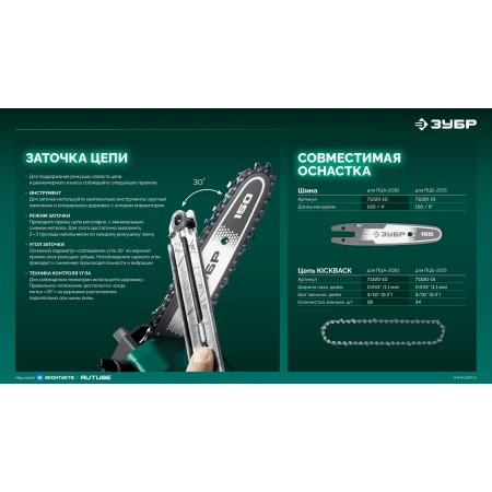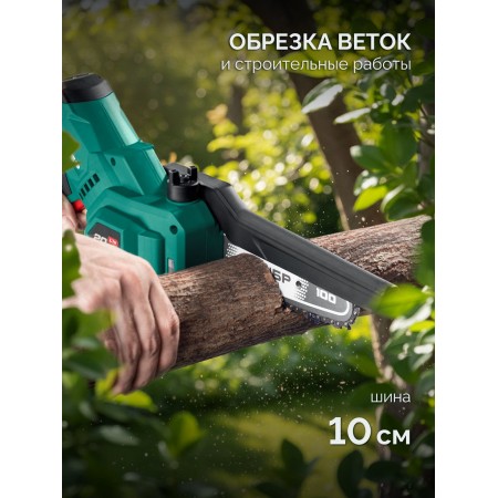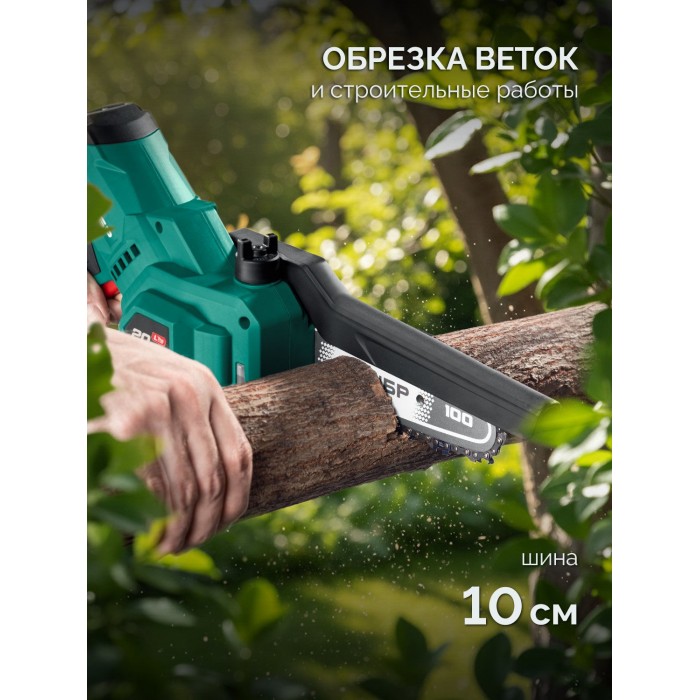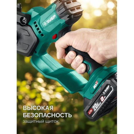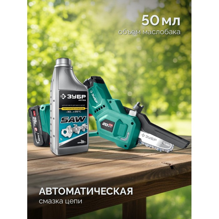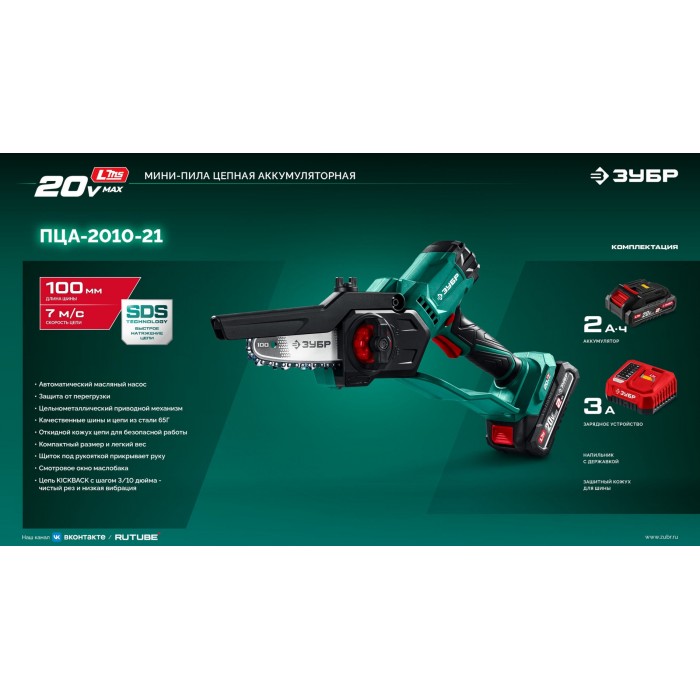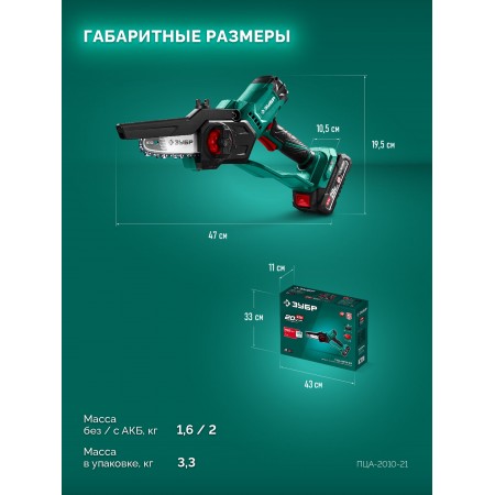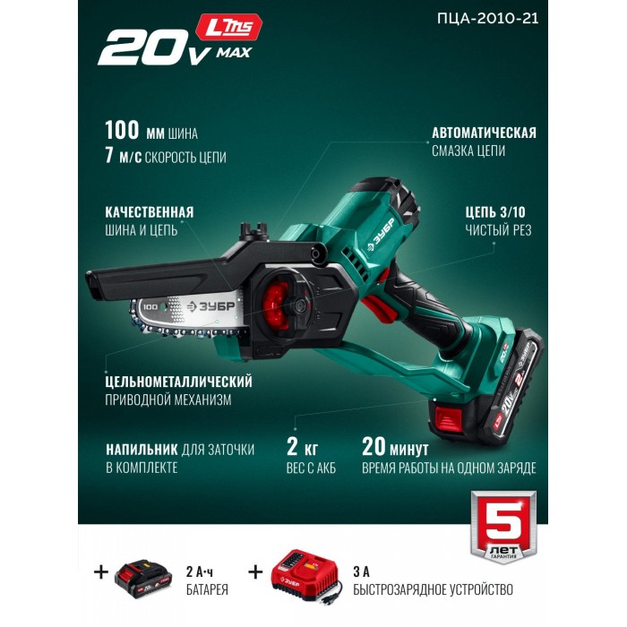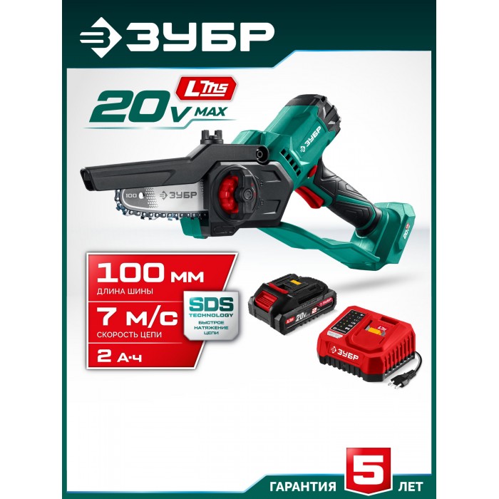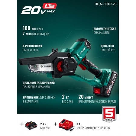 ЗУБР 20 В, 100 мм шина, 1 АКБ LMS (2 Ач), мини-пила цепная аккумуляторная (ПЦА-2010-21)