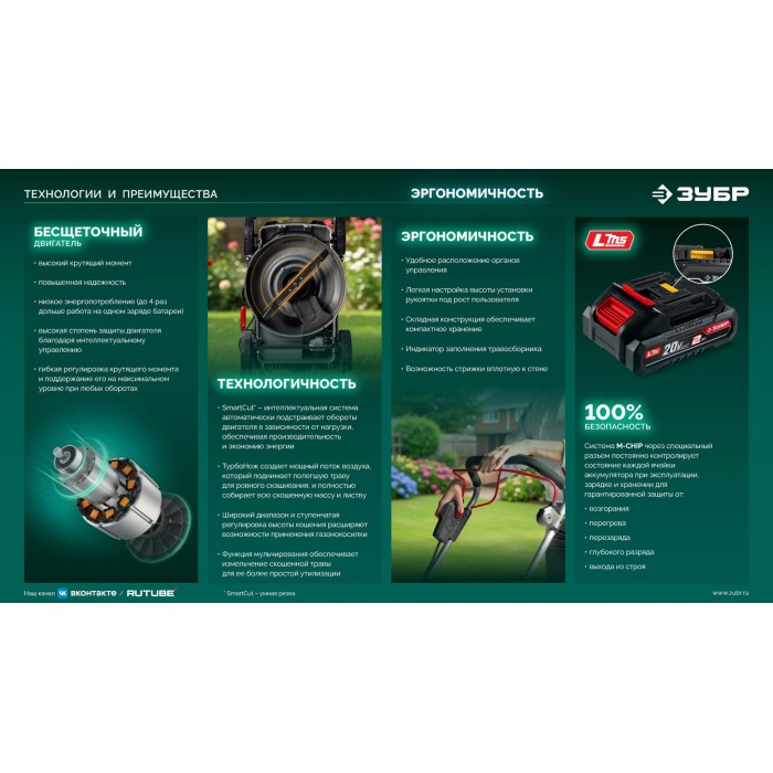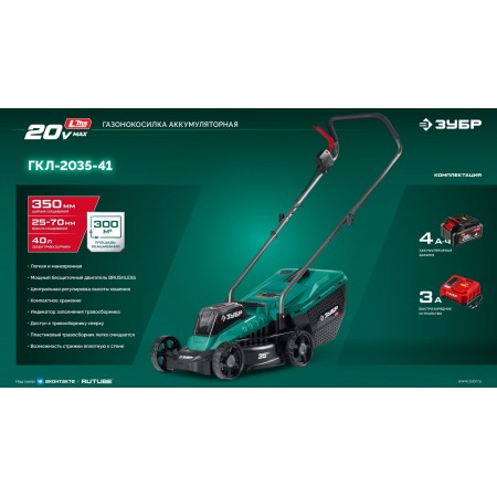ЗУБР 20 В, 350 мм, 1 АКБ LMS (4 Ач), газонокосилка аккумуляторная бесщеточная (ГКЛ-2035-41)
