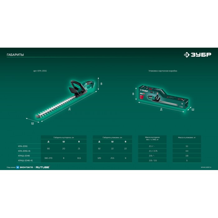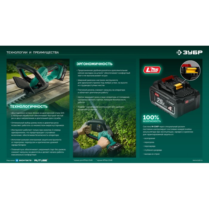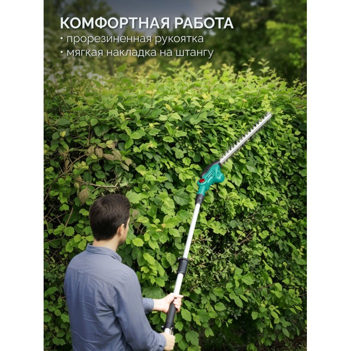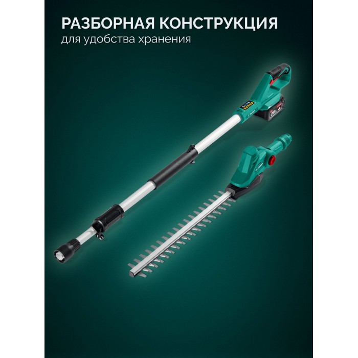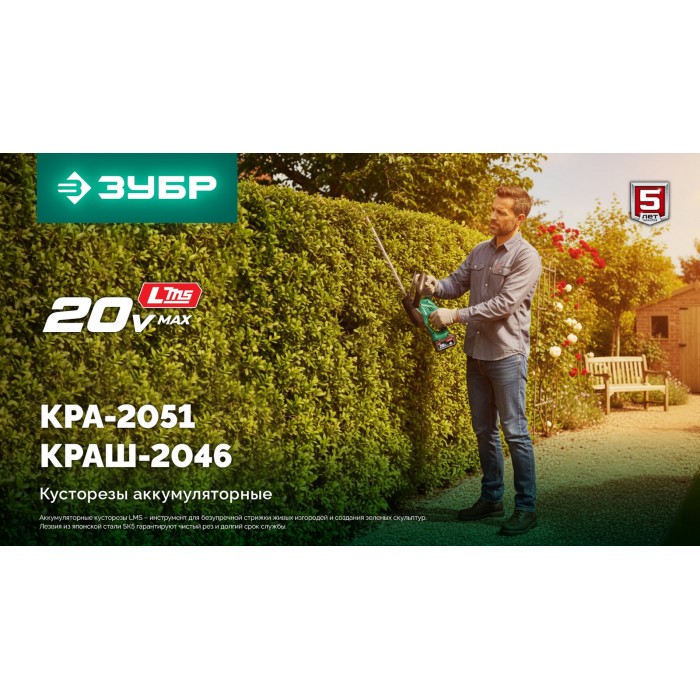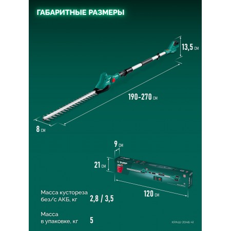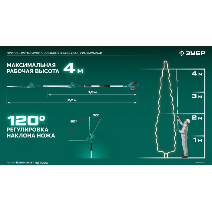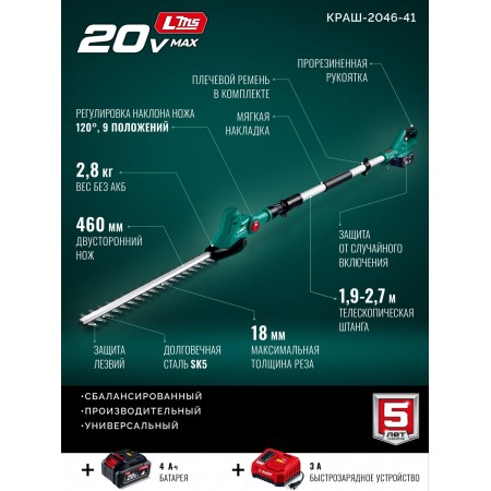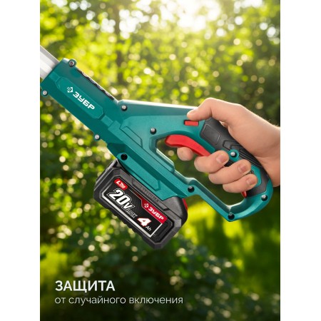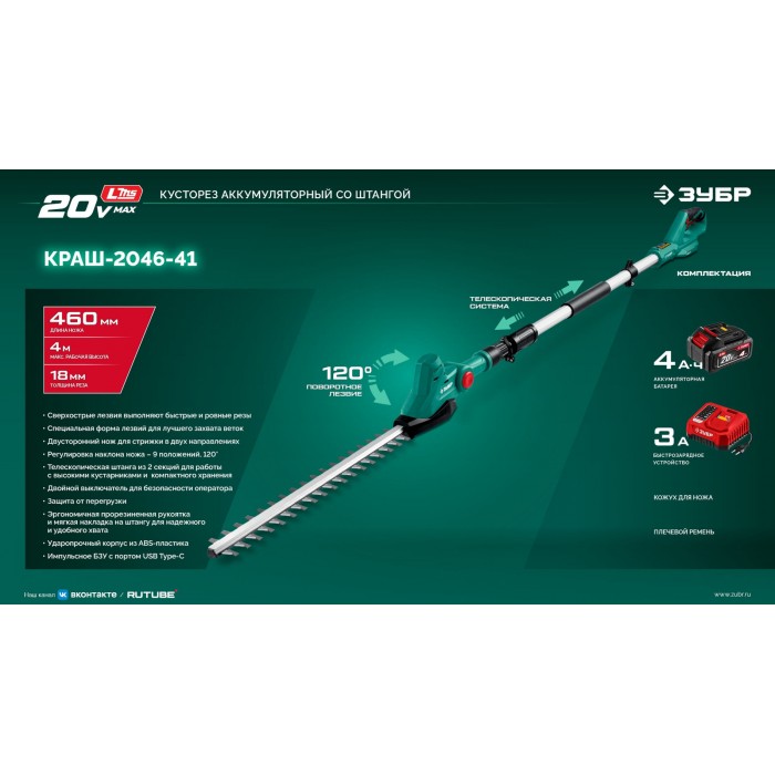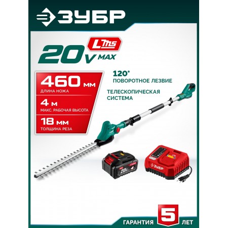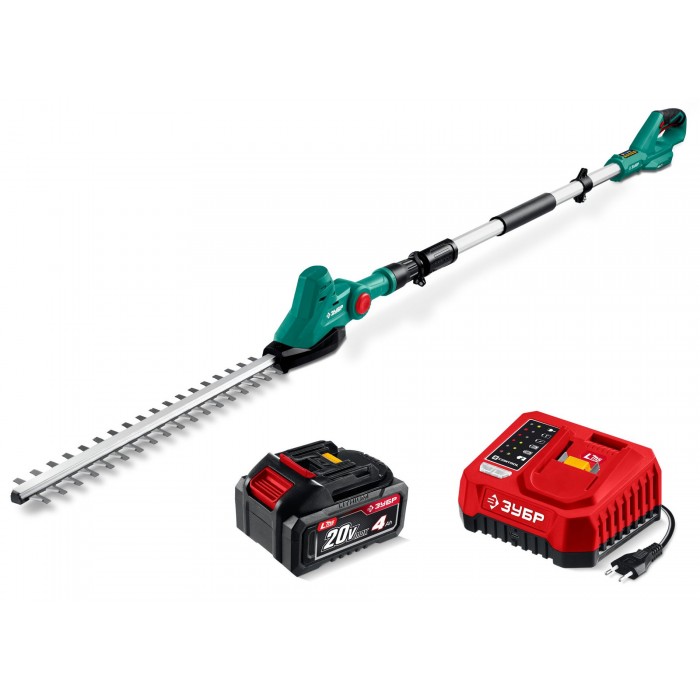 ЗУБР 20 В, 460 мм, 1 АКБ LMS (4 Ач), кусторез аккумуляторный со штангой (КРАШ-2046-41)