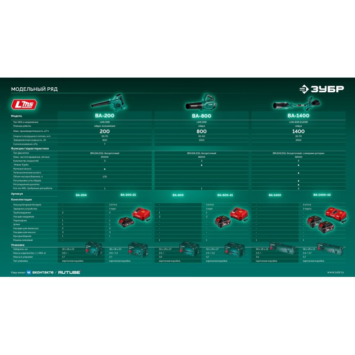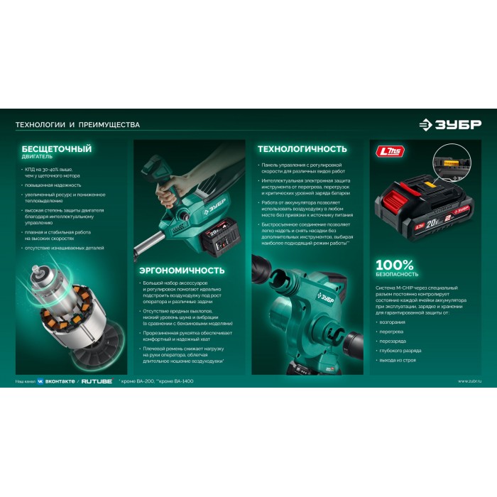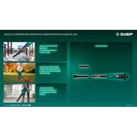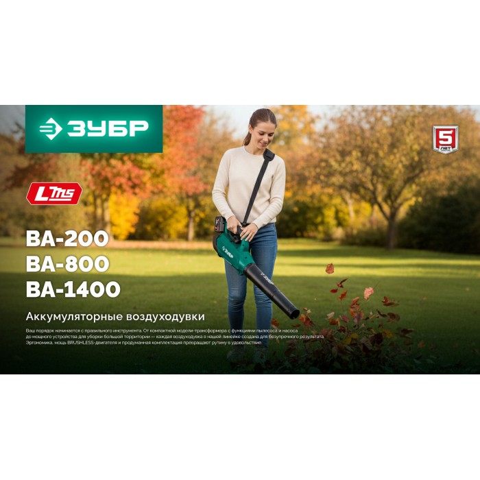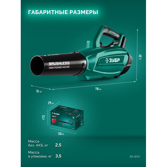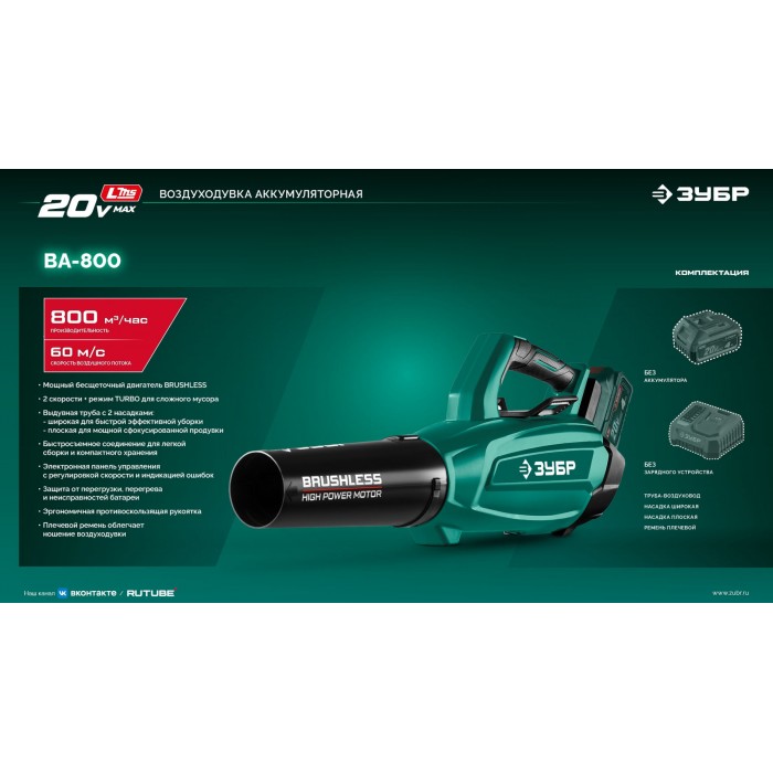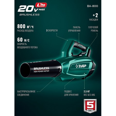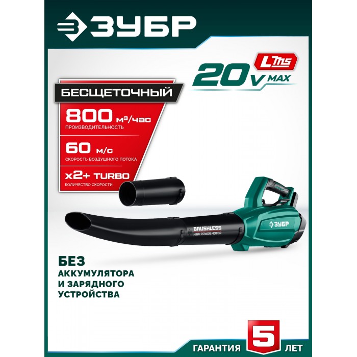 ЗУБР 20 В, 800 м3/ч, без АКБ (LMS), воздуходувка аккумуляторная (ВА-800)