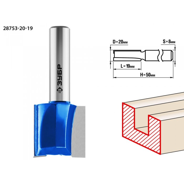 Фреза пазовая прямая 20?19 мм хвостовик 8 мм ЗУБР Профессионал 28753-20-19