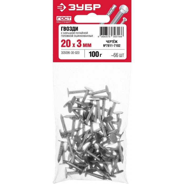 Гвозди 20?3 мм с большой потайной головкой цинк 100 г ЗУБР 305096-30-020