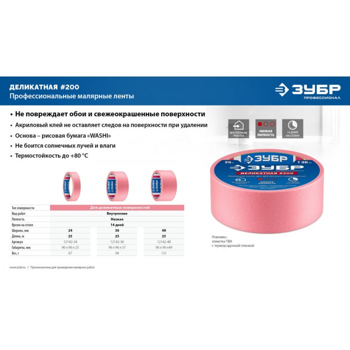 Малярная лента для деликатных поверхностей предназначена для работы с покрытиями, требующими особого ухода. Стоек к УФ-лучам, влаге, температуре до +80°С, надежно приклеивается к поверхности, позволяя получившейся линии быть максимально ровной, без подтеков краски. Легко удаляется, сохраняя первоначальный вид поверхности, не оставляя после себя следов клея.