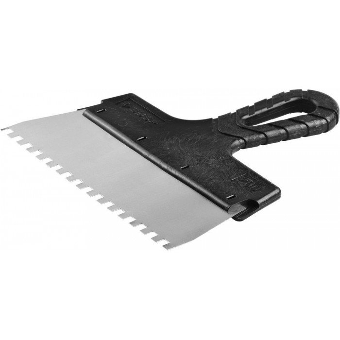 Благодаря зубчатой кромке шпатель идеально подходит для работы со строительными и клеевыми смесями, полотно из нержавеющей стали обеспечивает надежность и долгий срок службы инструмента, а удобная пластмассовая рукоятка создает условия для комфортной работы