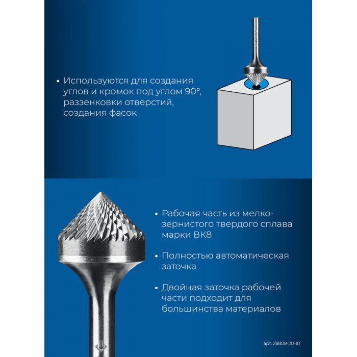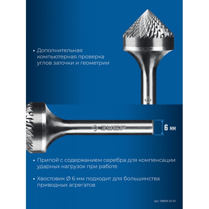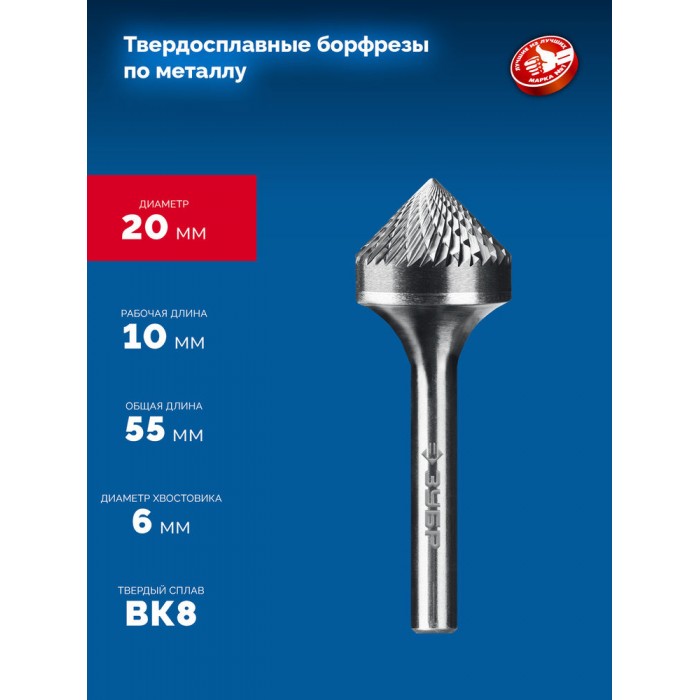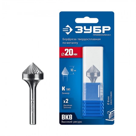 Борфреза твердосплавная 20?10 мм, тип K (зенкер с вершиной 90°), хв-к 6 мм ЗУБР ПРОФЕССИОНАЛ 28809-20-10