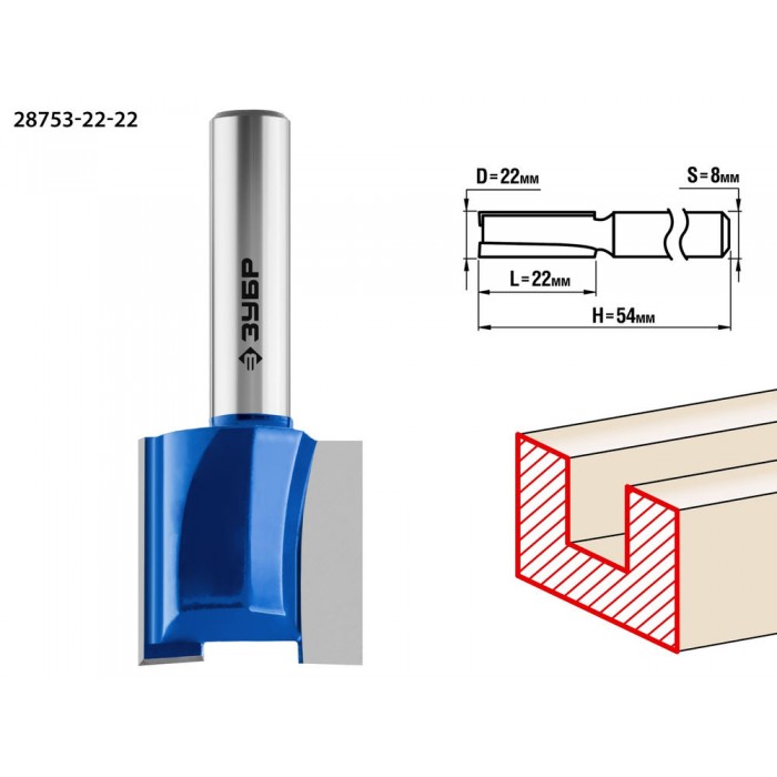 Фреза пазовая прямая 22?22 мм хвостовик 8 мм ЗУБР Профессионал 28753-22-22