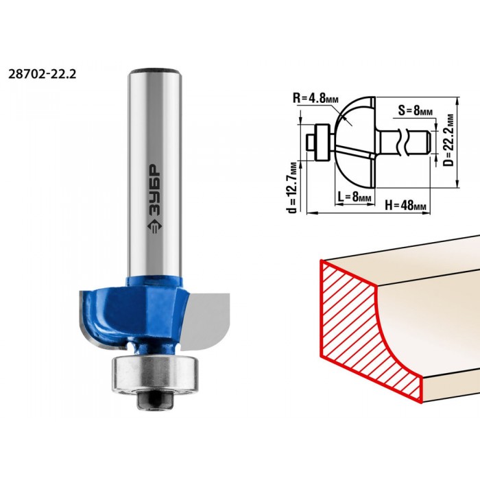 Фреза кромочная калевочная №2 22.2?8 мм радиус 4.8 мм ЗУБР Профессионал 28702-22.2
