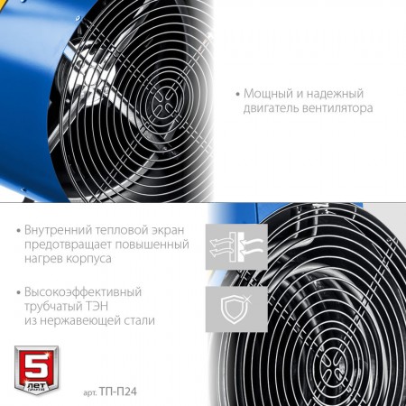 Профессиональные электрические тепловые пушки с питанием от трехфазной электрической сети эффективны для быстрого и направленного обогрева складских и производственных помещений, ангаров и мастерских, благодаря большой площади нагревательных элементов и мощным двигателем вентилятора. Надёжная доработанная конструкци,обеспечивают защиту как пользователя, так и тепловой пушки в случае возникновения нештатных ситуаций. Сделано в России