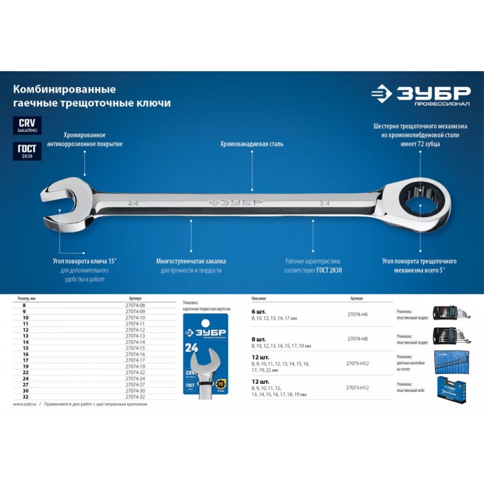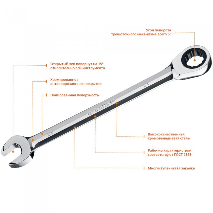 Ключ гаечный комбинированный трещоточный 24 мм Профессионал ЗУБР 27074-24