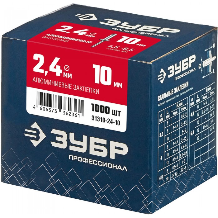 Заклёпки алюминиевые 2.4?10 мм 1000 шт ЗУБР Профессионал 31310-24-10
