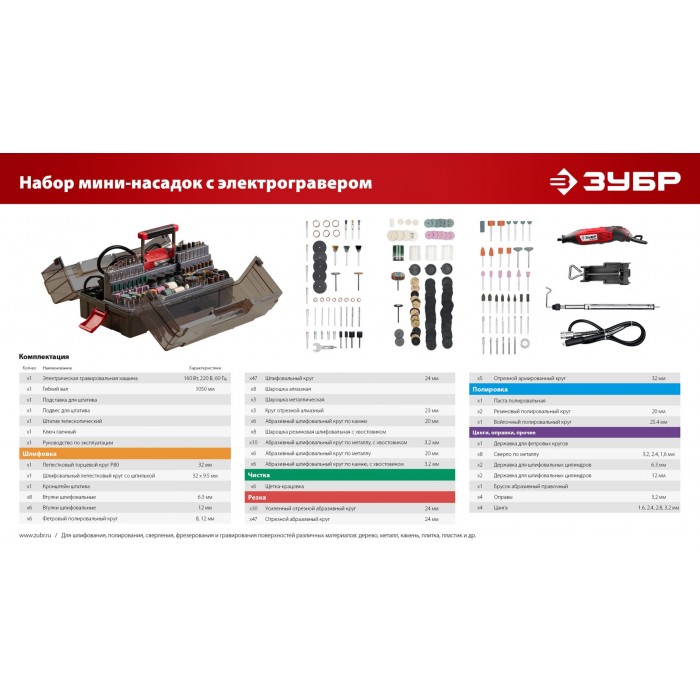 Набор мини-насадок позволяет в домашних условиях осуществлять тонкую чистовую высокоточную обработку различных материалов без применения дорогостоящего профессионального оборудования. Неоспоримым преимуществом шлифовально-полировальных инструментов ЗУБР являются их высокая производительность, большой рабочий ресурс и универсальность применения при обработке различных материалов