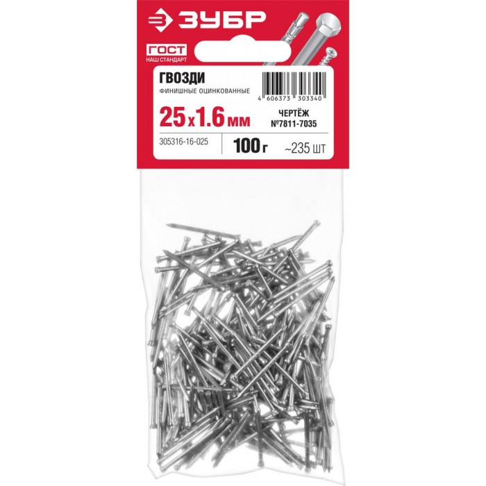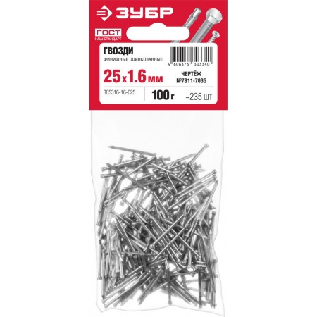 Гвозди финишные 25?1.6 мм цинк 100 г ЗУБР 305316-16-025